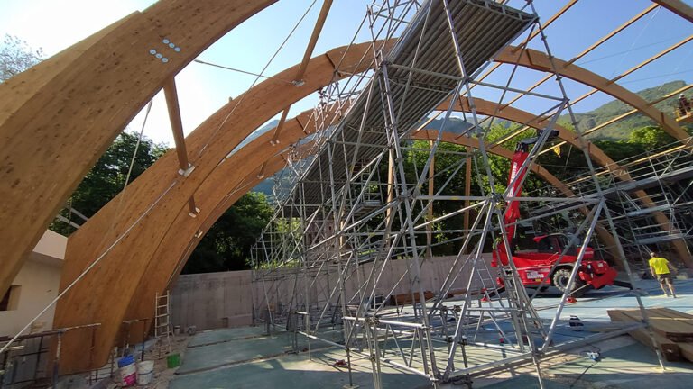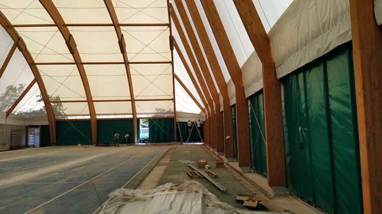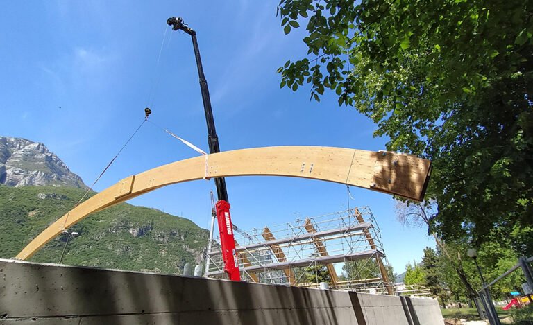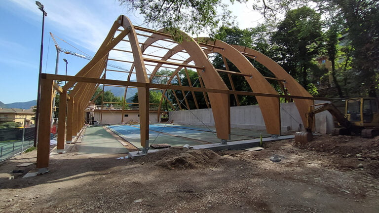 Realizzazione della copertura di un campo da tennis mediante archi in legno lamellare di abete.