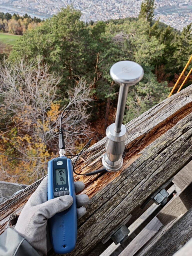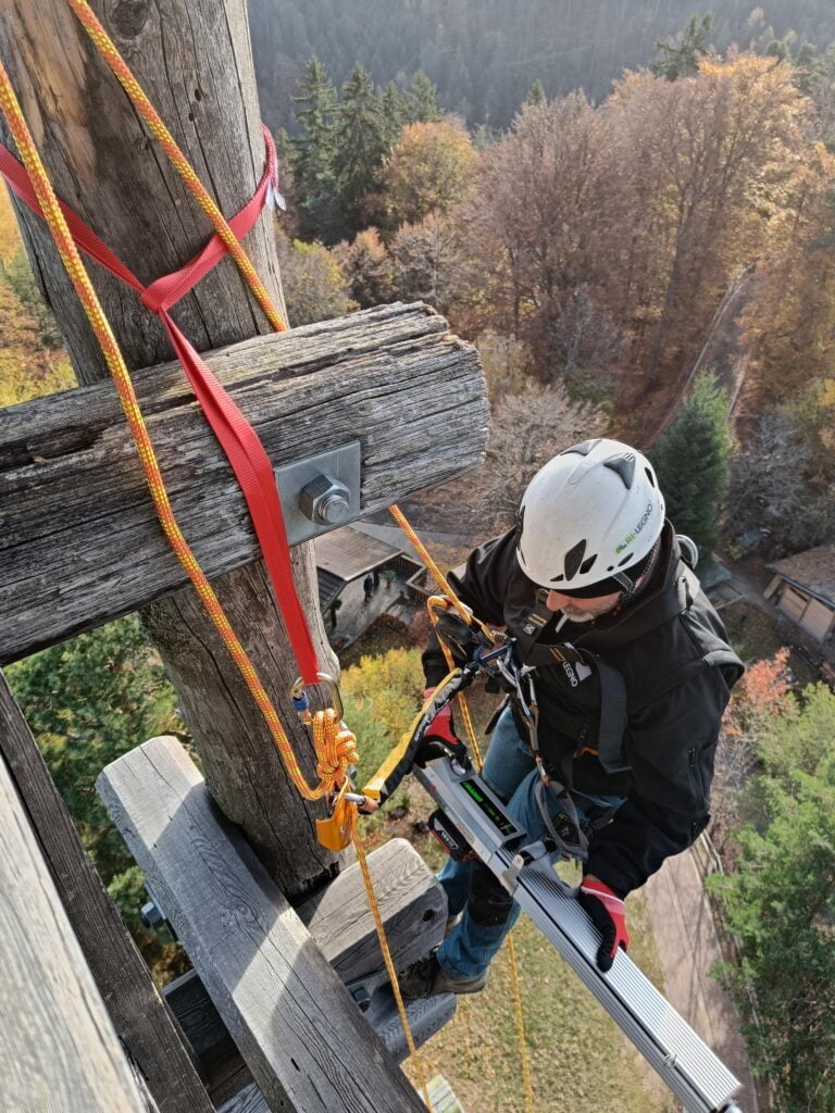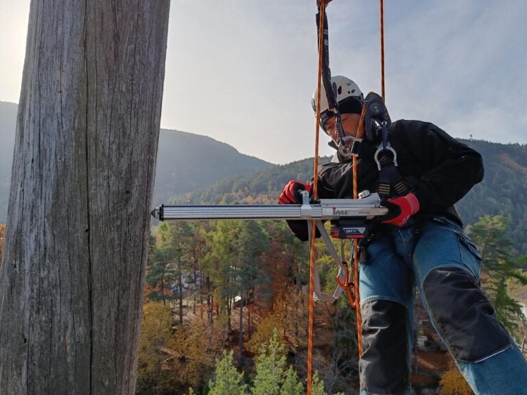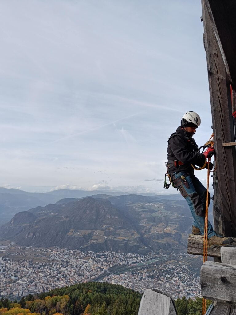 Per valutare la sicurezza strutturale della Torre Panoramica del Colle, è stata indispensabile condurre un'indagine diagnostica accurata su tutte le parti lignee e le connessioni. La sfida e la complessità di questo lavoro hanno riguardato principalmente la logistica dell'intervento; per indagare in modo approfondito l'intera torre, è stato necessario effettuare l'indagine in fune, utilizzando collegamenti audio e video con i diversi operatori.