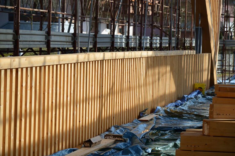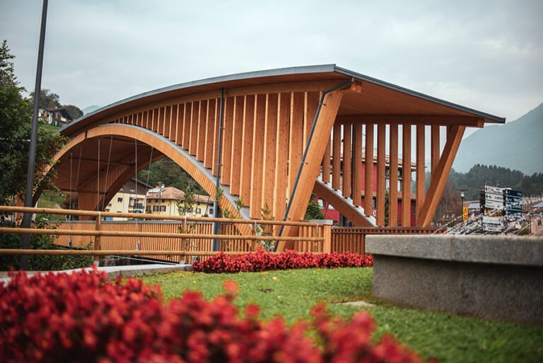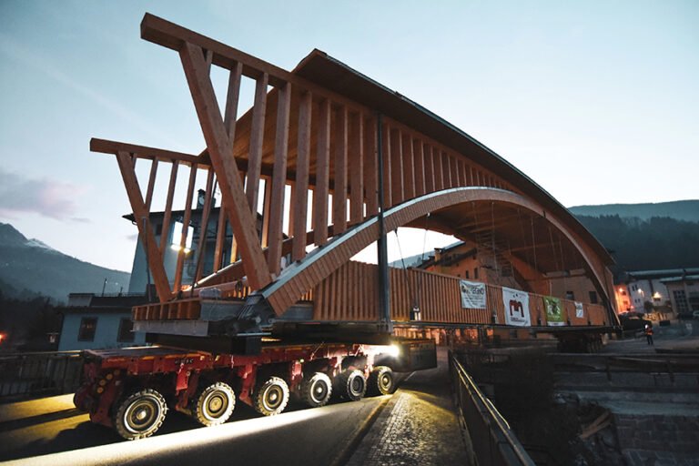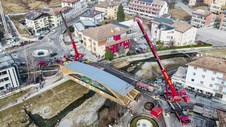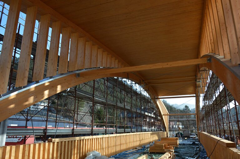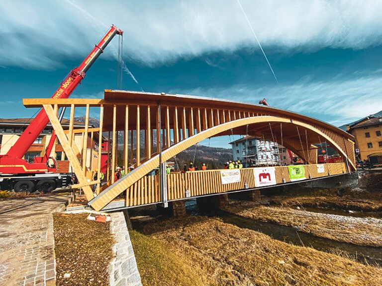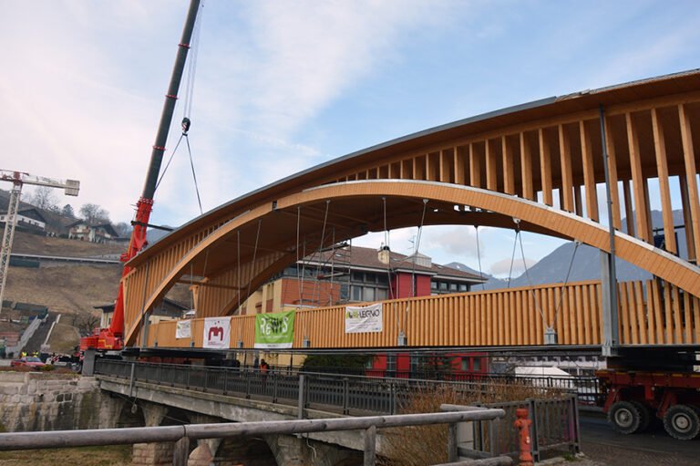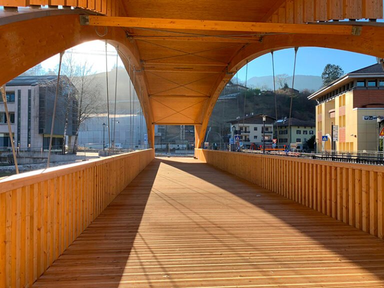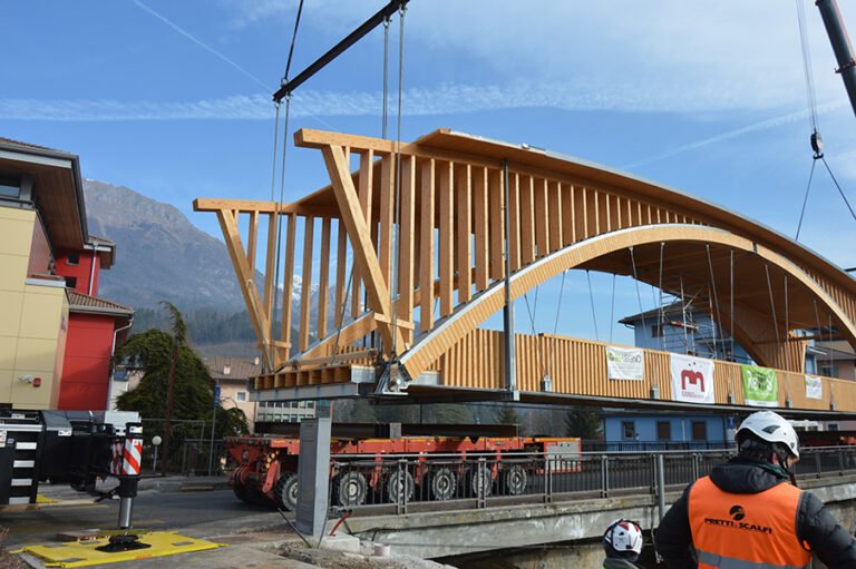 Realizzazione di un ponte pedonale coperto con struttura in legno lamellare, il sistema statico portante sono due archi a tre cerniere con una luce di quasi 40 m, il ponte è inoltre largo ben 6 m per un peso complessivo di 70 tonnellate.